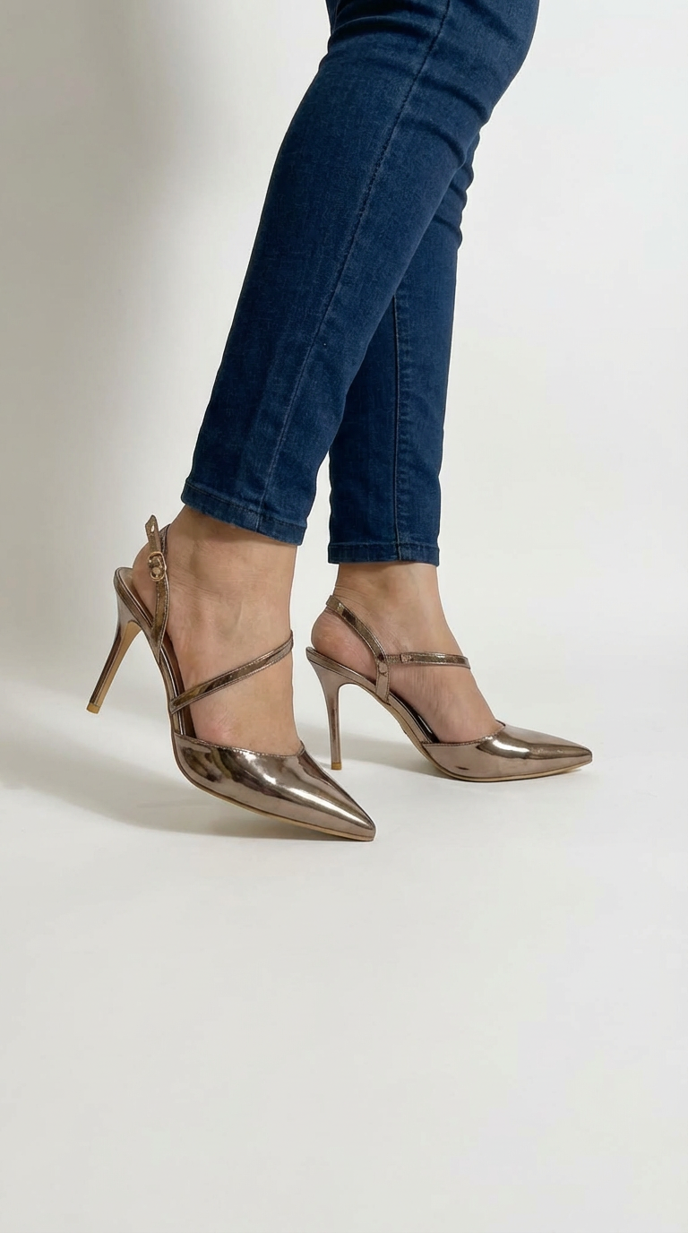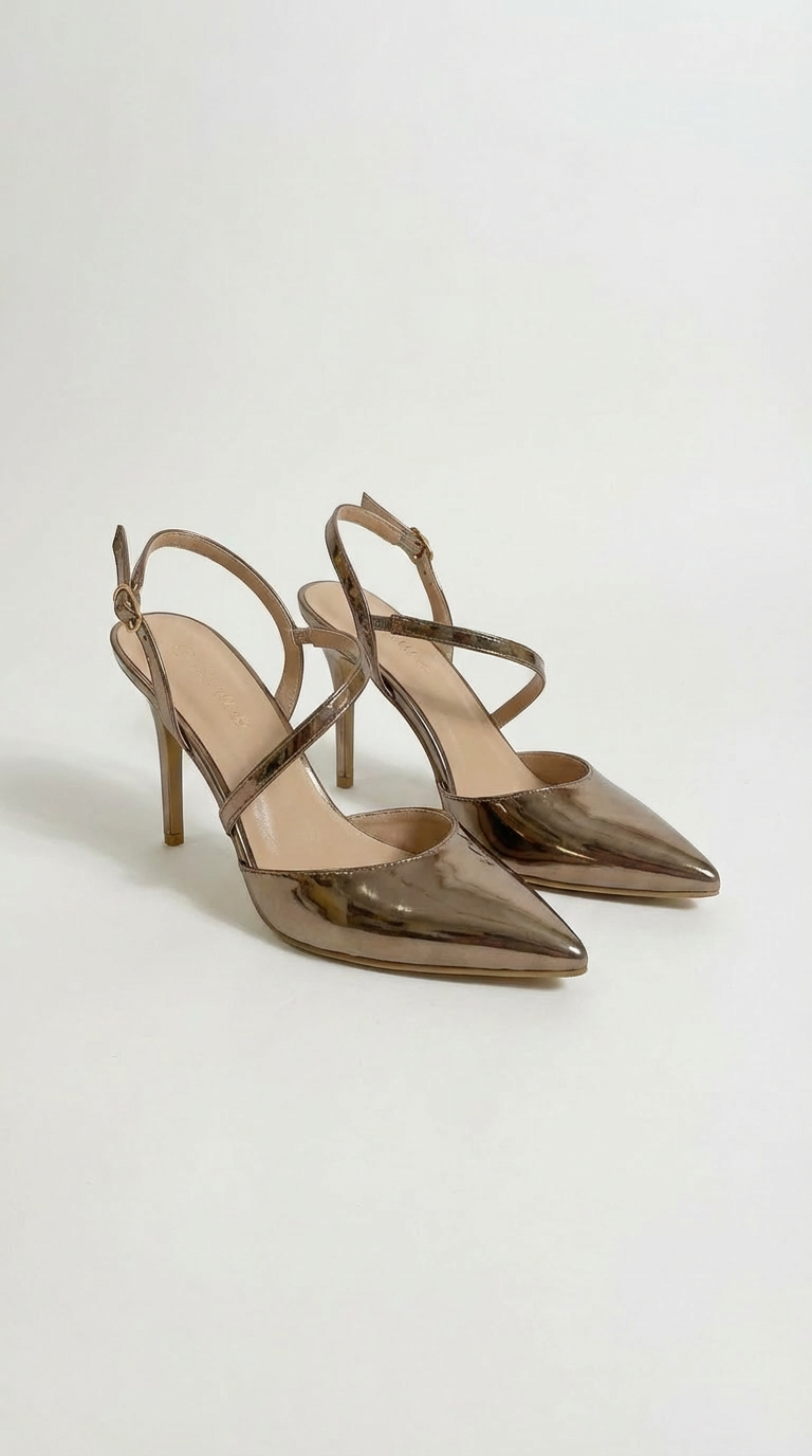 Step out in style with these stunning metallic bronze slingback heels. Featuring a chic pointed toe, elegant criss-cross straps, and a secure buckle closure, these high heels are perfect for any special occasion.